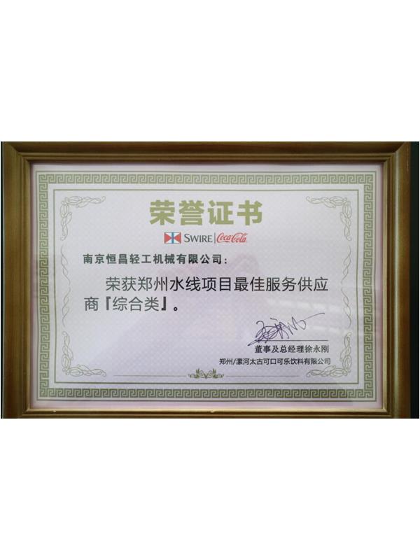 南京恒昌包裝作為后段整包商,在鄭州太古可口可樂48000bph水線項目中獲得“最佳服務(wù)供應商”殊榮!